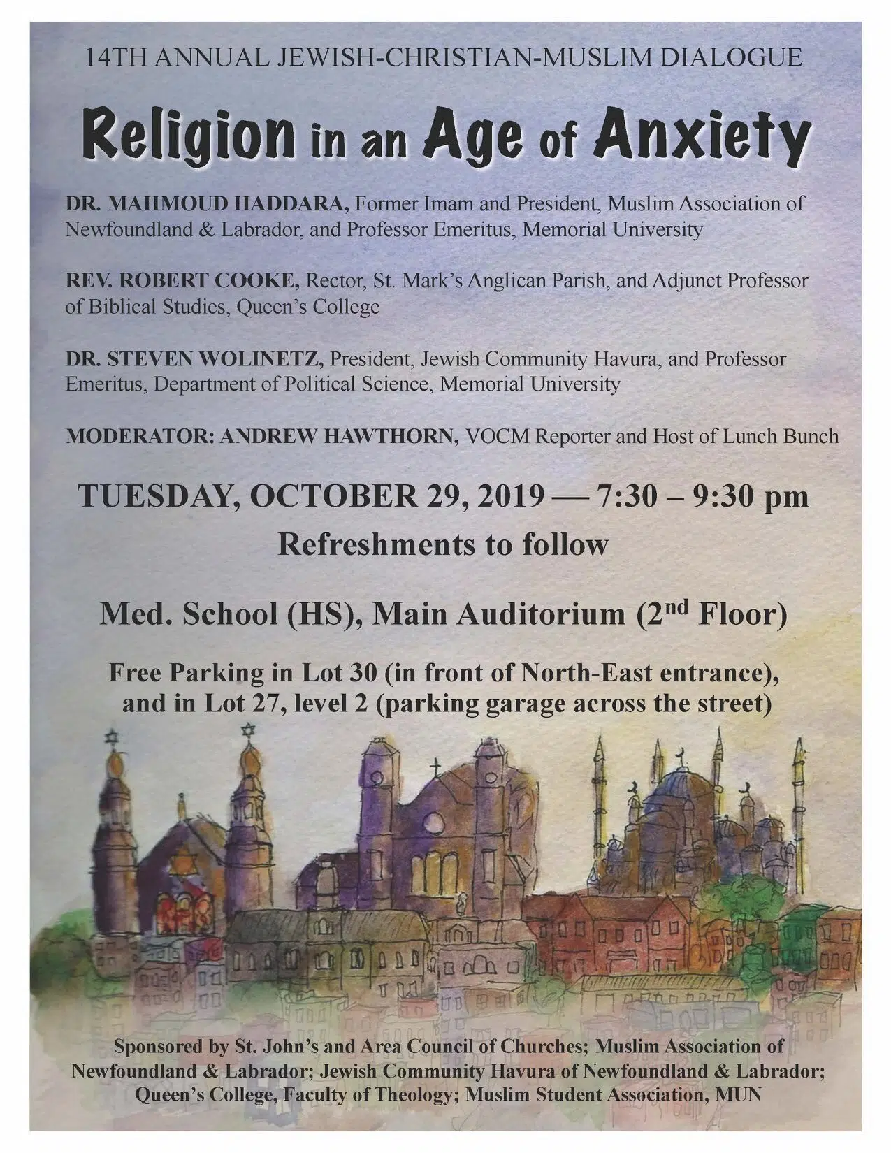 Representatives from the three main Abrahamic traditions will be present, including Dr. Mahmoud Haddara, former Imam of the al-Noor Mosque, Dr. Steven Wollinetz, President of the Jewish Community Havura, and Reverend Robert Cooke of St. Mark’s Anglican Church in St. John’s.