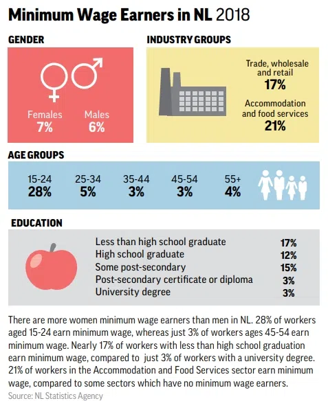 Among minimum wage earners in Newfoundland and Labrador in 2018, seven per cent were female, and six per cent were male, while 28 per cent were between the ages of 15 and 24. The biggest portion—17 per cent—have not graduated high school.