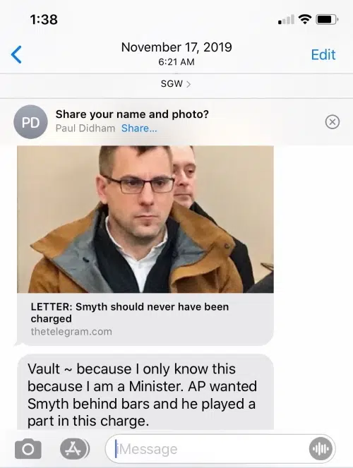 A screenshot obtained by VOCM News shows the specific exchange that has lead Smyth to make the complaint.