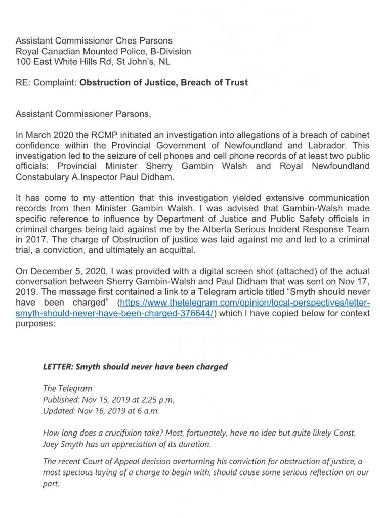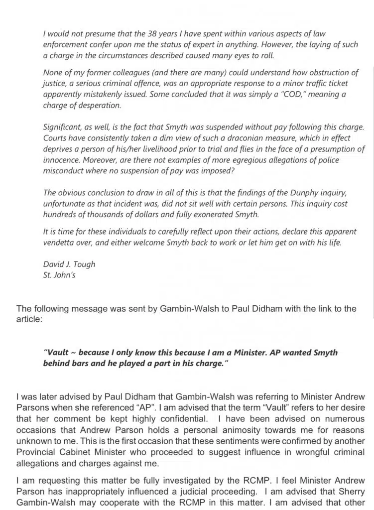 The document references text communications of former Minister Sherry Gambin Walsh and Acting RNC Inspector Paul Didham, that were uncovered in an investigation into information being shared between the two.