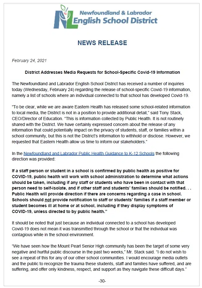 English School District CEO Tony Stack says they’re concerned over releasing information that could impact those in the school community, however, they do not regularly receive such information from public health, noting that it is not their information to withhold or disclose.