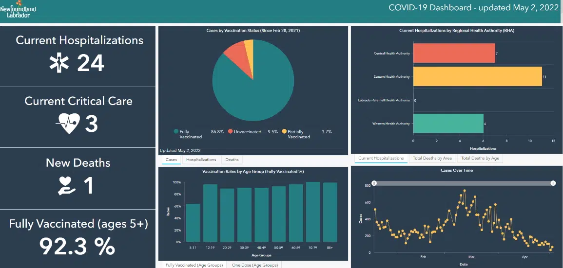 The provincial government’s COVID dashboard was updated at noon, showing 24 people in hospital due to the virus, with three in critical care.