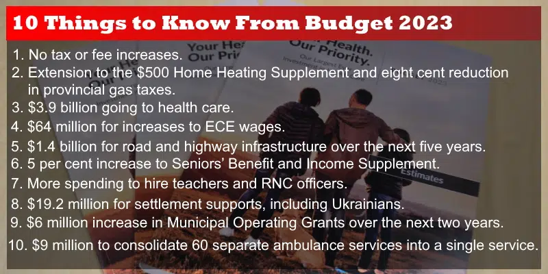 There are no tax or fee increases this year. A number of cost-of-living measures—including extensions to the $500 home heating supplement for those who heat with oil, the 8 cent reduction in provincial taxes on gas and diesel, and increases to the Senior’s Benefit, Income Supplement and the elimination of the retail sales tax on home insurance, will continue—but there is no mention of a repeat of the $500 cost of living cheque at this time.