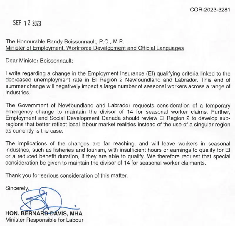 Labour Minister Bernard Davis has written the federal Employment minister asking that recent changes made to EI qualifying criteria be reversed.