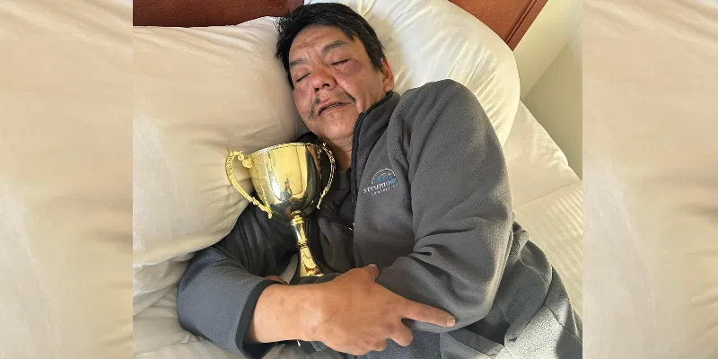 Racer Randy Malleck, resting with his trophy. (Peter Penashue/X)