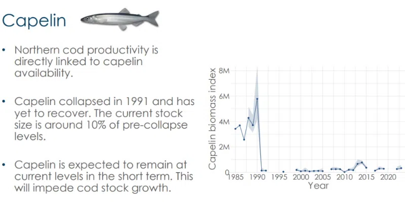 Regular says capelin, which is a key food source for cod, collapsed in 1991 and the stock has yet to recover, sitting at about 10 per cent of its pre-collapse abundance.
