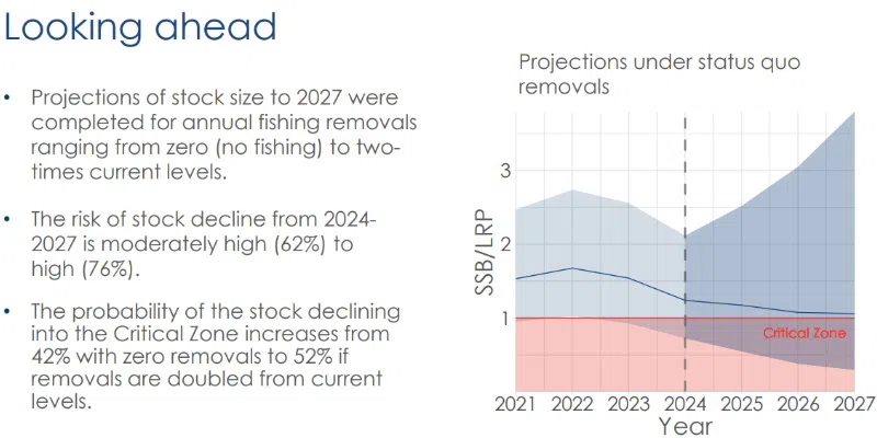 “There’s a probability that the stock will be dipping into the critical zone, even under zero removals,” says Regular. “It ranges from about a 42 per cent chance that the stock will dip into the critical zone under a no fishing scenario…and it increases to 52 per cent if removals are doubled from current rates.”