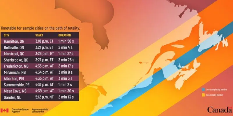 Kate Murphy, a Science Interpreter with the Johnson Geo Centre and MUN Botanical Garden, says day will turn to night in some areas of the island around 5:10 to 5:15 p.m. depending on your location.