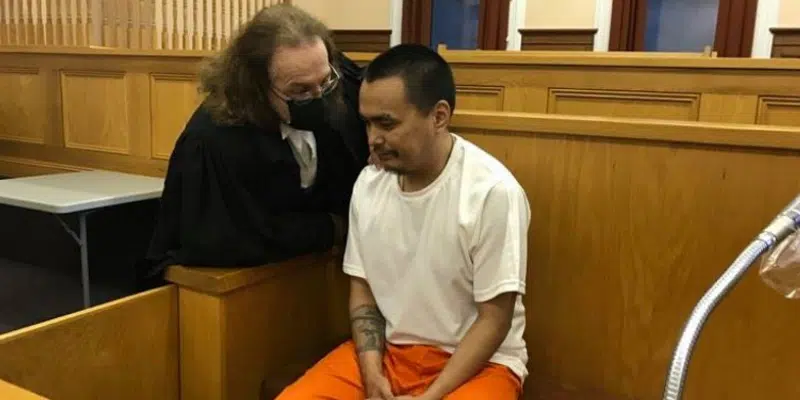 Sulurayok is shown in Supreme Court in August 2021 with co-defence counsel Bob Buckingham. (VOCM News)