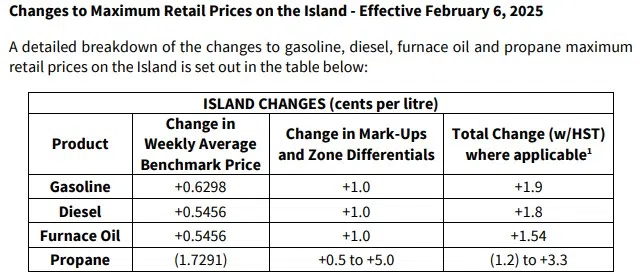 The cost of gas and diesel on the island is up by 2 cents. Furnace oil is up by a cent and a half. The price of propane will change within the range of increasing by nearly 3 cents or going down by about a cent.