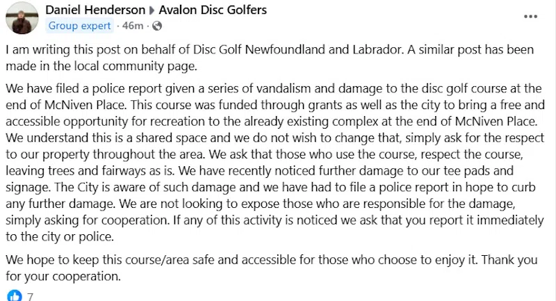 In posts on social media and local community pages, Avalon Disc Golfers, on behalf of Disc Golf Newfoundland and Labrador, say they’ve had to file a police report given “a series of vandalism and damage” to the course at the end of McNiven Place.