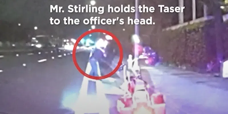 In the video, the police highlight instances where they allege Stirling removes the officer’s taser, holds it to the officer’s head, and points it at him.