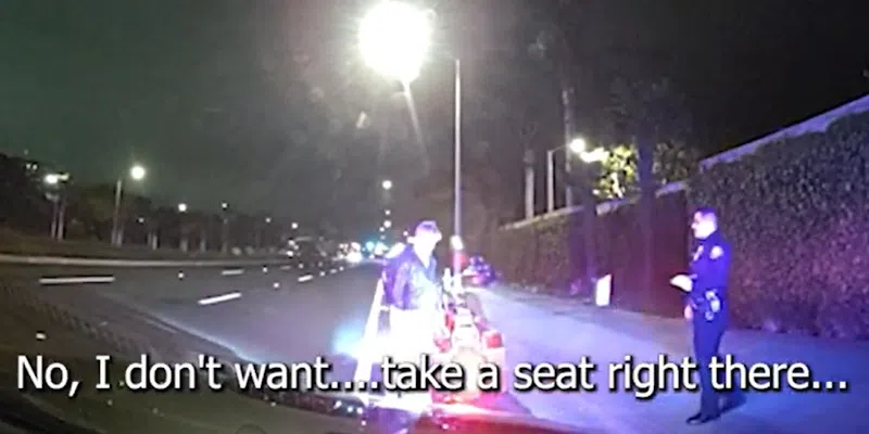 He is pulled over and gets off his bike. The officer can be heard asking Stirling to sit down multiple times, which he refuses to do.