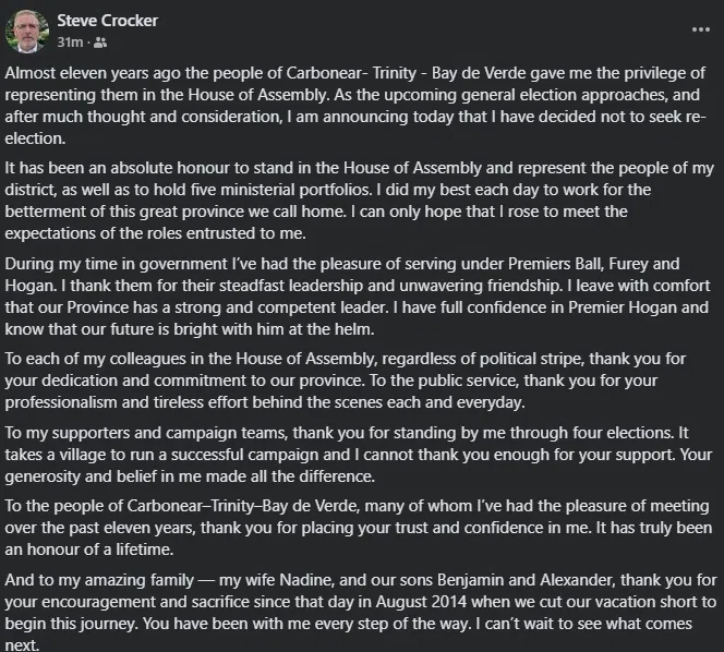 Crocker says it has been an “absolute honour” to serve as an elected official for the last 11 years, and gives thanks to his family, constituents, and colleagues.