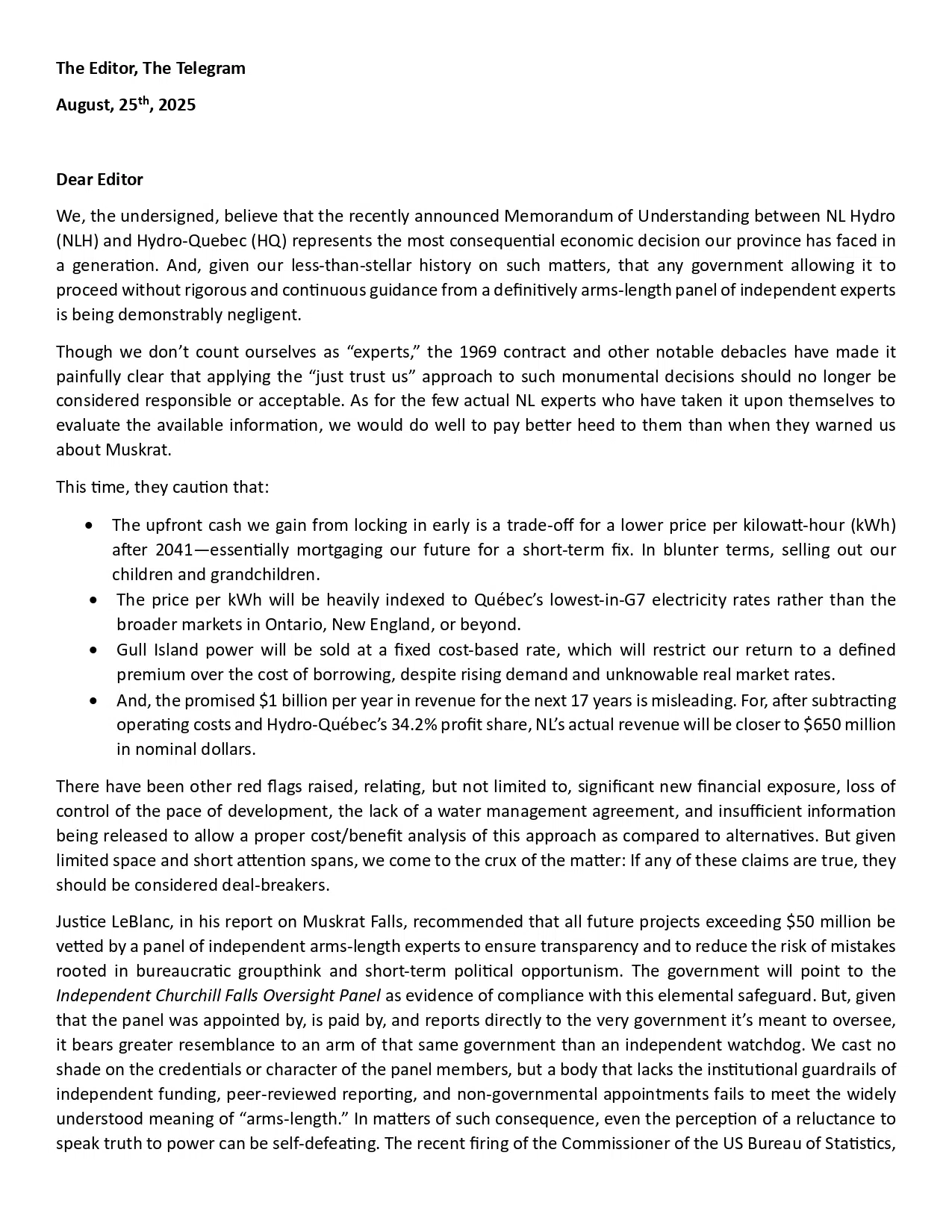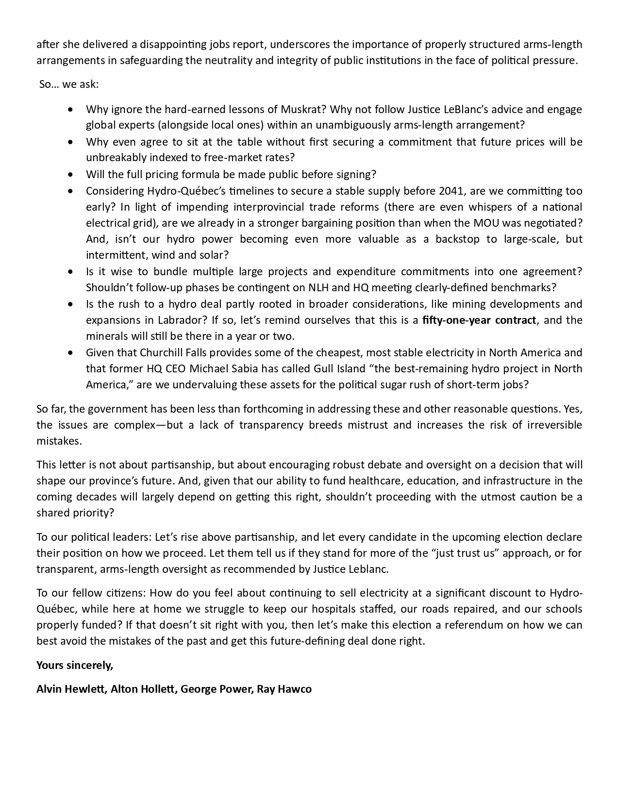 Former politicians, high-ranking civil servants and business people say the MOU must be restructured with each component addressed on a stand-alone basis. They call the MOU the biggest strategic error in the history of Newfoundland and Labrador in that it hands Hydro Quebec a monopoly over Churchill River power.