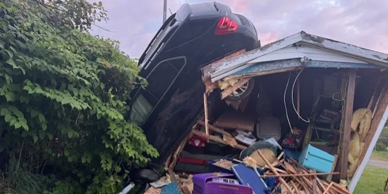 RCMP in Bay St. George are investigating following a dramatic crash involving a stolen vehicle that launched over a guard rail, and went airborne before crashing onto the roof of a shed in Stephenville Crossing.