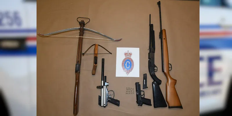 A search resulted in the seizure of 90 pairs of activewear pants, three pellet guns, a high-velocity paintball gun, two crossbows and ammunition.