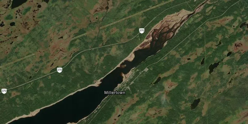 Satellite images show the lake bed clearly exposed in some areas, particularly near Millertown where the lake feeds into the Exploits River.