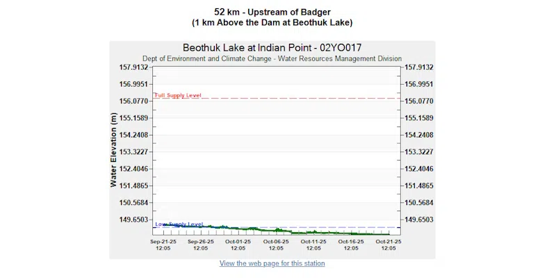 Since 2009, the average level of Beothuk Lake at Indian Point has been 153.7 metres. As of October 20th, the level was at 148.83 metres.