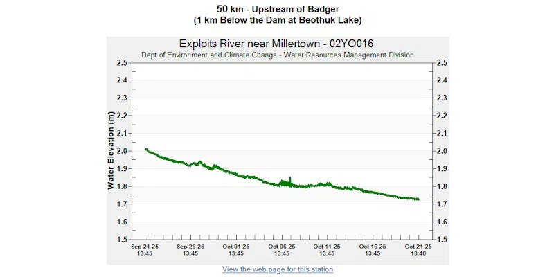 Near-real time data shows water elevation levels on the Exploits near Millertown have dropped by almost a foot over the last month.