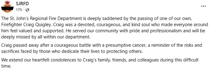 The St. John’s Regional Fire Department has posted a black band on its social media accounts as a sign of mourning and other fire departments have done the same.