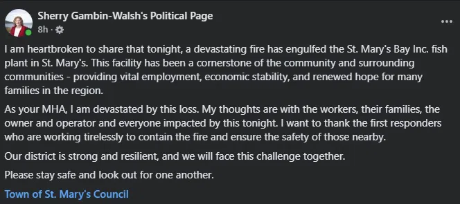Area MHA Sherry Gambin-Walsh says she is “heartbroken” to hear of the fire at the facility, which she calls a “cornerstone” of the area that provided employment, economic stability and “renewed hope” for many.