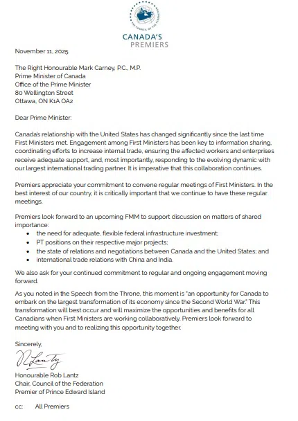 Canada’s premiers have written Prime Minister Mark Carney seeking his involvement in regular meetings of the Council of the Federation “in the best interest of the country.”