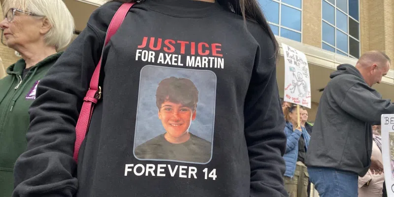 A family member wears a Justice for Axel Martin at a rally outside Confederation Building (VOCM News)