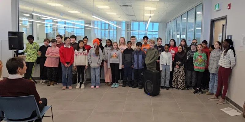 Grade 5 students from St. Teresa’s Elementary sing for those gathered for the ribbon-cutting (VOCM News)