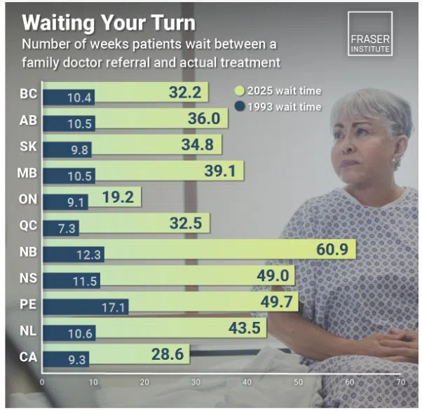 In 1993, it took about 10 and a half (10.6) weeks for a patient in Newfoundland and Labrador to receive treatment following a doctor’s referral. In 2025 that wait time had extended to 43.5 weeks.