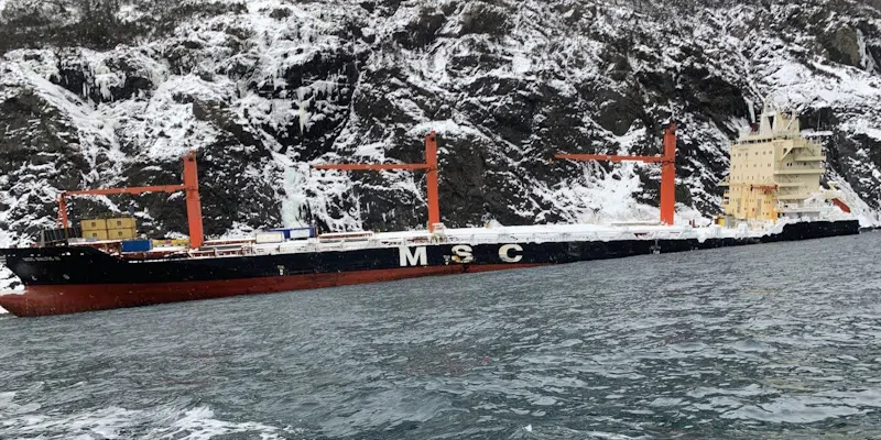Fuel and cargo have been removed from the ship, but the ship itself remains, battered by wind and wave.